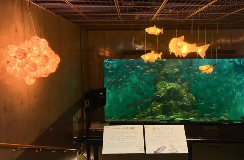 今回の事業でできた鮭ちょうちんは、展示会場となったサーモン科学館でも大変好評であったため、館内の大水槽前に常設展示となりました。